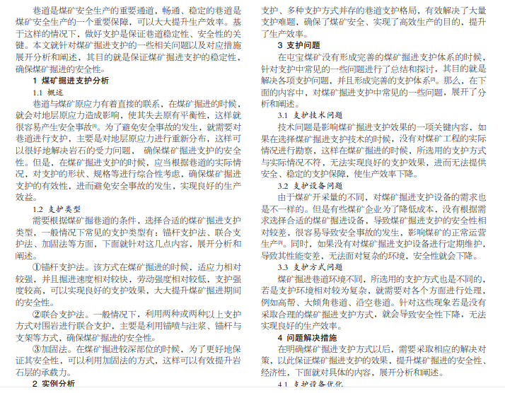近几年,随着社会生产力的不断提升,对煤炭资源的需求也越来越大,在这样的情况下,煤炭行业逐渐提升生产 效率。在煤矿掘进时,安全成为一项重点需要关注的问题,一般都是利用支护的方式,确保煤矿掘进的稳定性和安全性。但是 在煤矿掘进支护的时候,还是会存在一些问题,需要相关人员切实进行处理,以此提升煤矿掘进的安全性,避免安全事故的发 生,实现良好的生产效率和经济效益。