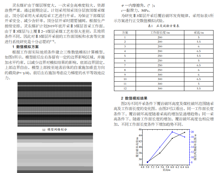 本文以灵东煤矿大采高综采铺网开采为背景,采用数值模拟方法,研究不同开采条件对大采高综采铺网开采顶板 覆岩破坏高度的影响。结果表明:随着采高或工作面长度的增加,顶板覆岩破坏高度均呈递增趋势,灵东煤矿大采高综采铺网 开采时应避免采高或工作面长度过大。研究对保障Ⅱ 3 煤层工作面安全高效开采具有重要意义,同时对今后采面的超前防治水 和支护工作具有有效的指导意义。