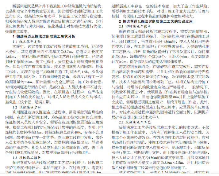 巷道反掘法工艺是煤矿过断层施工技术的重要组成部分,对提高施工效率、保证施工作业安全性意义重大,需要 对相关技术进行分析。本文主要研究掘进巷道反掘法工艺应用现状,并且结合煤矿隧道施工问题,对掘进巷道反掘法工艺的实 践应用进行重点研究,以供相关人员借鉴与参考。