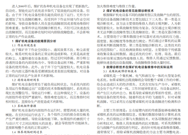 煤矿机电设备是煤炭开采、运输作业链条中不可或缺的动力供应装置。井下作业条件恶劣,加之机电设备持续运 转时间较长,导致设备故障频发,严重制约了煤矿开采作业进程。而故障诊断技术可以精准定位到故障部位,探明故障原因, 针对性制订维修方案,帮助煤矿企业实现了提效增收的美好愿景。本文将围绕煤矿机电设备的故障原因、故障诊断技术在煤矿 机电设备维修中的实际运用效果展开论述。
