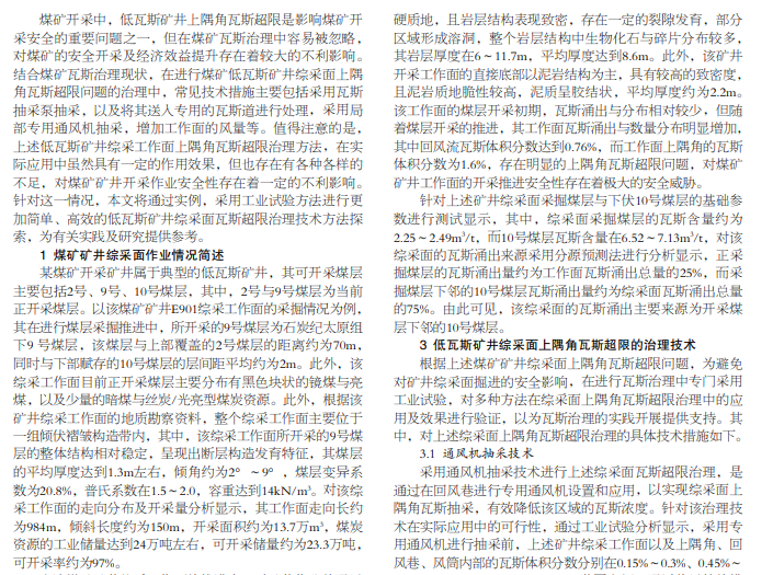 本文结合实例,采用工业试验方法,研究低瓦斯矿井综采工作面采掘推进过程中存在的采空区以及开采煤层瓦斯 涌入,导致综采工作面上隅角瓦斯超限问题,在加大风量、正压稀释、风机抽采、改进总排负压抽采等多种技术方法的综合应 用下,对低瓦斯矿井综采工作面上隅角瓦斯治理技术及其应用效果进行研究,以供参考。