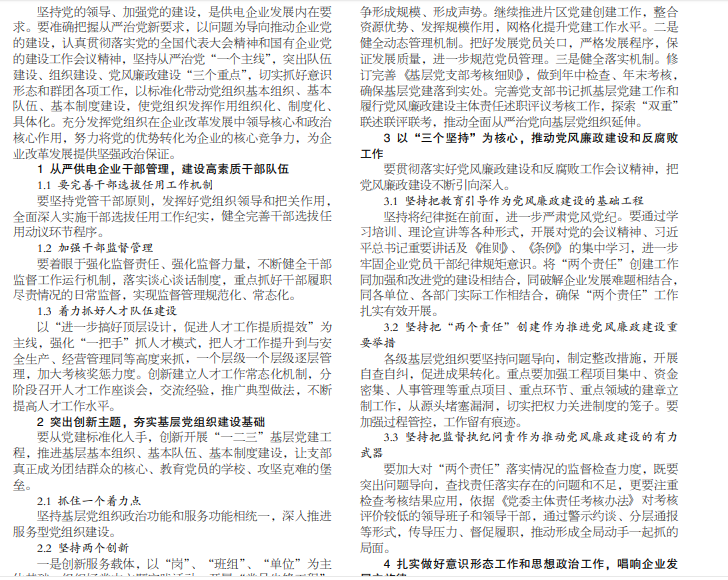 本文从建设高素质干部队伍,夯实基层党组织建设基础,推动党风廉政建设和反腐败工作,扎实做好意识形态工 作和思想政治工作,筑牢企业党建组织保障等几方面对供电企业党建工作进行研究。