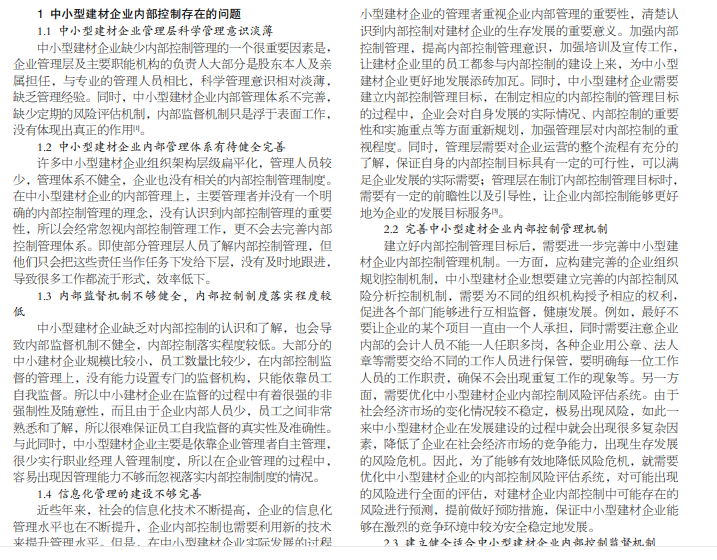 随着社会经济的不断发展,建材行业已成为我国经济民生的重要产业。中小型建材企业占建材行业的七成左右, 所以中小型建材行业的发展直接影响到产业的发展。在中小型建材发展的过程中,出现了或多或少的管理问题,其中比较严重 的就是生产经营效益低、运营成本费用较高、企业内部控制管理混乱。本文将探讨中小型建材企业内部控制与执行过程中可能 存在的问题,并提出提高中小型建材企业内部控制管理水平的方法及对策,推动中小型建材企业健康持续的发展。