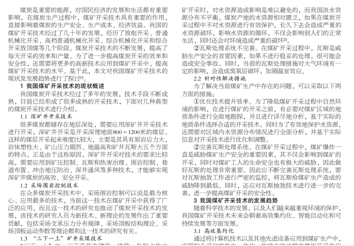 煤炭是重要的能源,煤矿的开采技术对提高煤矿开采效率、保证煤矿的开采安全都有重要的意义,因此加强对煤 矿开采技术的研究具有重要意义。基于此,本文对我国煤矿开采技术的现状及发展趋势进行了探讨。