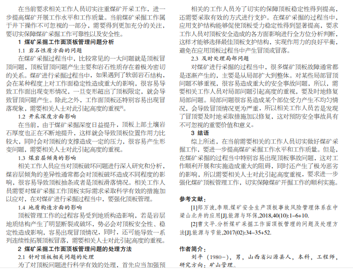 在当前,要求相关工作人员高度重视煤矿采掘工作,在煤矿开采的过程当中,采掘工作属于不可忽视的重要工作 之一,要切实地保障煤矿采掘工作的可靠性和安全性,需要相关的工作人员对煤矿采掘实施全方位的维护和管理工作。在当前 煤矿采掘工作当中,顶板属于比较特殊的一部分,特别容易出现各种故障问题,需要相关工作人员对此高度重视,同时要对顶 板采取科学有效管理,这对煤矿采掘工作顺利开展和实施具有不可忽视的现实意义。本文主要是对煤矿采掘工作面顶板管理问 题处理方法进行研究,以供相关专业人士进行参考和借鉴。