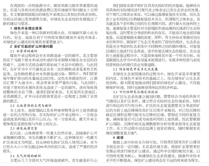 现如今,在我国经济发展当中,煤炭能源起到的作用十分重要,人们对煤炭资源需求的增加对我国的资源储备以 及环境都造成了一定的影响。目前我们国家的煤炭产量以及消费占据了全世界的三分之一,但是就煤炭行业来说,粗放型煤炭 开采不仅会造成严重的资源浪费,同时还会对环境造成破坏。为了解决上述存在的问题,需要不断推进绿色矿山建设,绿色矿 山是矿产资源开发利用与经济社会发展、生态环境保护相协调的矿山,以实现资源利用节约集约化、开采方式科学化、企业管 理规范化、生产工艺环保化、闭坑矿山生态化的目的。
