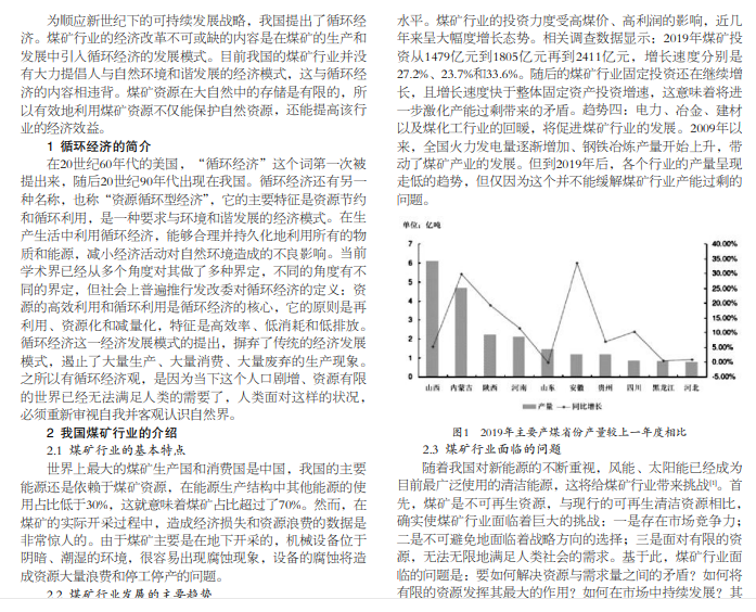 循环经济在煤矿中的实践与应用实质就是:在煤矿资源上实现低开采、高利用、低排放,在煤矿资源节约的基础 上再实现循环利用,形成与环境和谐的经济发展模式。随着我国经济改革的到来,煤矿产业中实现循环经济已经成为改革的重 要内容,要求在煤矿产业中实现“资源到产品再到再生资源”的生产流程。本文将对循环经济、煤矿行业趋势以及循环经济在 煤矿中的实践与应用展开深入的分析与探究。
