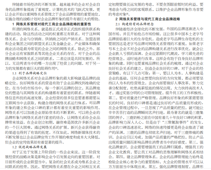 信息技术的高速发展,使得网络关系管理的热度越来越高。因此本文对网络关系管理与企业品牌战略管理在当今 时代的重要性做了简要的分析,通过做具体案例的分析阐述,突出品牌管理在企业管理当中的重要地位,希望管理层能对这方 面提起重视。