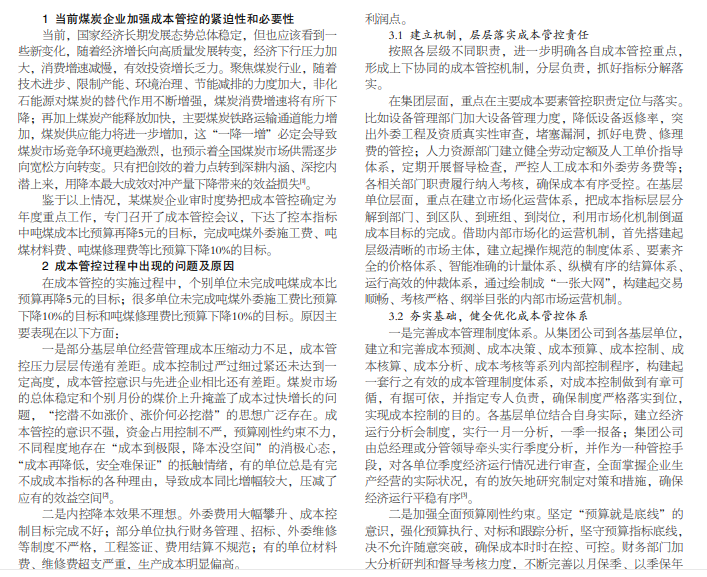 无论什么样的企业,不管内外部经营环境如何变化,成本管控始终是企业赢得市场、推动发展的重要利器。宏观 形势复杂多变,政策约束力度空前,各生产矿井不同程度地受限产政策及其他因素影响较大,依靠释放产能增加效益、摊薄成 本的路子已行不通。在本文中,将对某煤炭企业成本管控过程中遇到的问题及如何深化管控进行探讨。