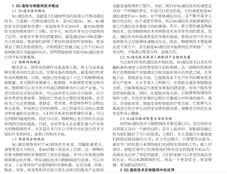 伴随着科学技术的进步与信息通信技术的更新换代,5G 通信技术已经成功替代 4G 通信技术,成为当今世界的核 心技术,在物联网产业链发展方面发挥着非常重要的作用。同时,物联网技术的发展,对人们实现真正的智慧生活发挥着非常 重要的作用。本文介绍了 5G 通信技术及物联网技术的概念及其两者结合的现状,并着重阐述了 5G 通信技术对推动人类智慧生 活方面所起到的积极作用。