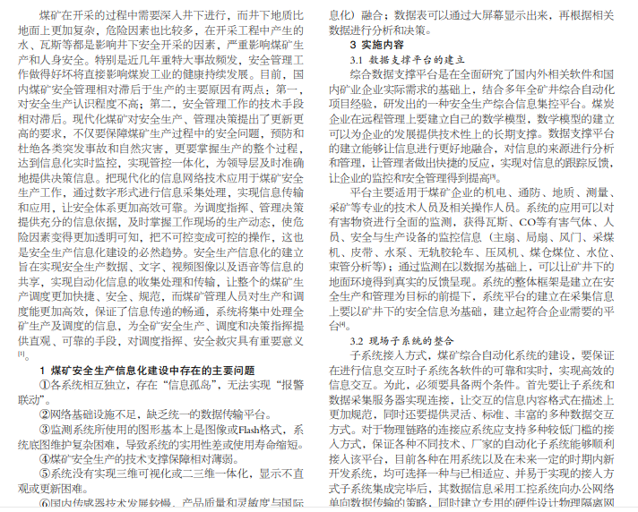 信息化建设的水平在一定程度上制约着煤矿安全生产工作的进行,因此,大力发展煤矿信息化建设是保障安全生 产最有效的途径。我矿始终坚持以信息化保障安全生产发展的道路,取得了显著效果。本文从安全生产信息化建设的基本概况 入手,然后讲述了我矿安全生产信息化建设的总体构架和主要做法,最后总结了安全生产信息化建设的重要意义。