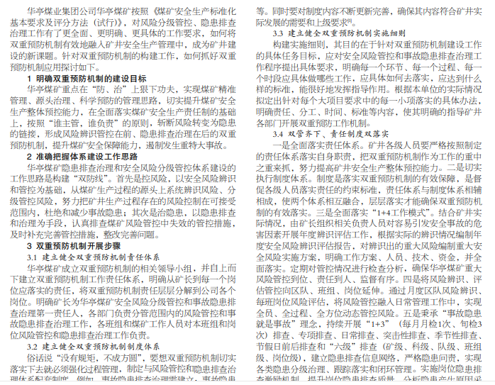 根据近年来全国煤矿发生的各类事故综合分析,大多数事故的发生主要是人的不安全行为造成,凸显出个体防范 意识差、风险辨识能力不强、隐患排查治理不到位等问题。华亭煤业集团公司华亭煤矿积极响应国家号召,为了遏制重特大事 故的发生,积极采取风险管控和隐患排查治理双重预防工作机制,推动安全生产重口前移,保护矿井作业人员的安全。