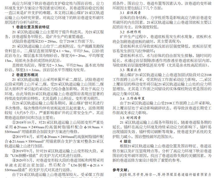 21 采区轨道运输上山行人下山巷道受到围岩压力变形严重,为了对巷道破坏原因进行分析,文中结合巷道围岩特 性,对巷道变形特性进行分析,找到巷道变形位置,分析出巷道变形主要原因为围岩硬度较小,结合水对围岩的软化作用,促 使围岩变形,为优化支护方案提供借鉴。