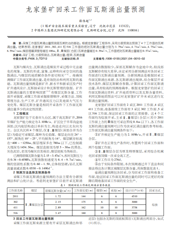 龙家堡矿回采工作面瓦斯涌出量预测