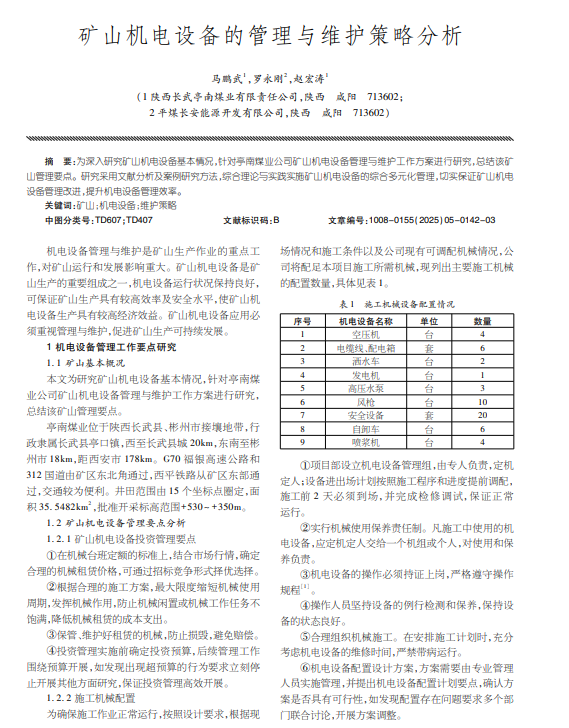 为深入研究矿山机电设备基本情况,针对亭南煤业公司矿山机电设备管理与维护工作方案进行研究,总结该矿 山管理要点。