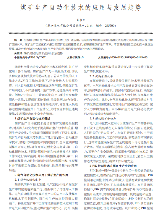 在当前的煤矿生产中,自动化技术已经广泛应用。