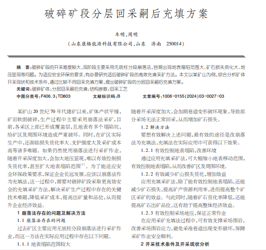破碎矿段的开采难度较大,现阶段主要采用无底柱分段崩落法,容易出现地表塌陷范围大、矿石损失贫化大、地 压显现等问题。