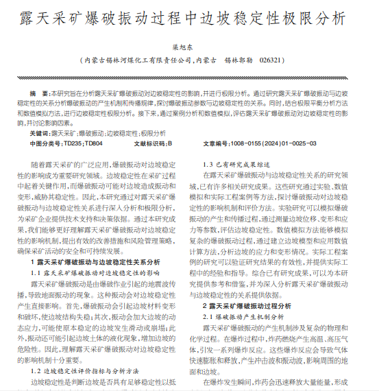 本研究旨在分析露天采矿爆破振动对边坡稳定性的影响,并进行极限分析。