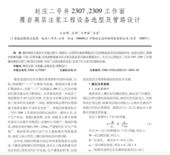 赵庄二号井2307、2309工作面 覆岩离层注浆工程设备选型及管路设计