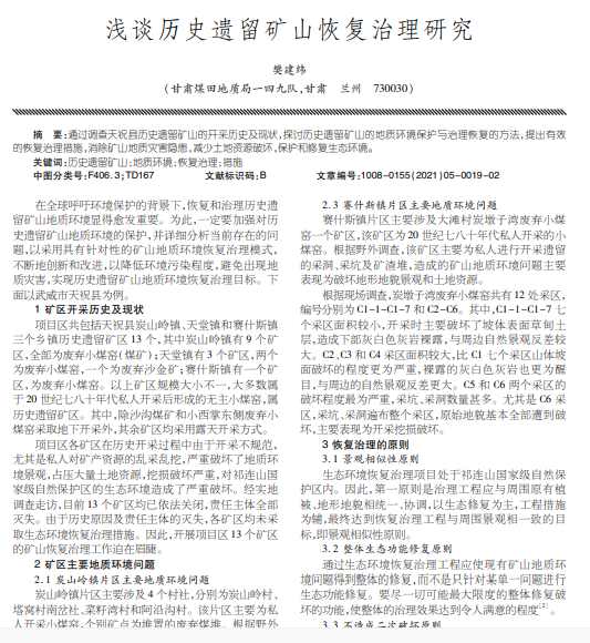 通过调查天祝县历史遗留矿山的开采历史及现状,探讨历史遗留矿山的地质环境保护与治理恢复的方法。