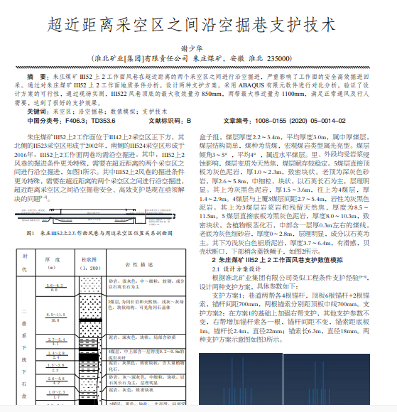 朱庄煤矿 III52 上 2 工作面风巷在超近距离的两个采空区之间进行沿空掘进,严重影响了工作面的安全高效掘进回 采。通过对朱庄煤矿 III52 上 2 工作面地质条件分析,设计两种支护方案,采用 ABAQUS 有限元软件进行对比分析,验证了设 计方案的可行性,通过现场实测,III522 风巷顶底的最大收敛量为 850mm,两帮最大移近量为 1100mm,满足正常通风及行人 需要,达到了很好的支护效果。