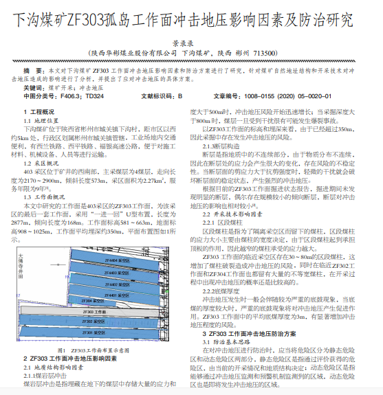 本文对下沟煤矿 ZF303 工作面冲击地压影响因素和防治方案进行了研究,针对煤矿自然地址结构和开采技术对冲 击地压造成的影响进行了分析,并提出了应对冲击地压的具体方案。
