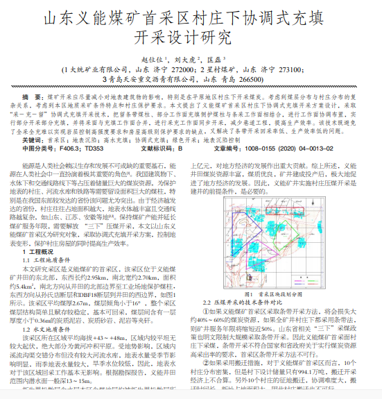 煤矿开采应尽量减小对地表建筑物的影响,特别是在平原地区村庄下开采煤炭。考虑到煤层分布与村庄分布的复 杂关系,考虑到本区地质采矿条件特点和村庄保护要求。本文提出了义能煤矿首采区村庄下协调式充填开采方案设计,采取 “采- 充-留”协调式充填开采技术,把留条带煤柱、部分工作面充填侧护煤柱与条采工作面相结合,进行工作面协调布置,实 行部分开采部分充填,并将采面与充填工作面合并,进行采充工作面同步开采,减少巷道工程,提高生产效率。该技术既避免 了全采全充难以实现岩层控制高强度要求和房屋高级别保护要求的缺点,又解决了条带开采回采率低、生产效率低的问题。