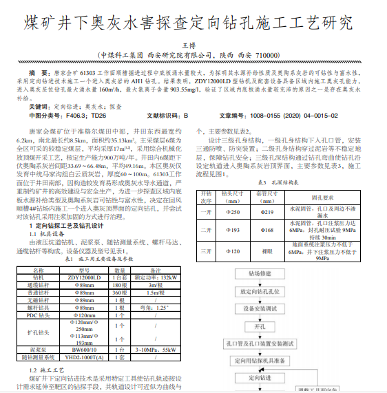 唐家会矿 61303 工作面顺槽掘进过程中底板涌水量较大,为探明其水源补给性质及奥陶系灰岩的可钻性与富水性, 采用定向钻进技术施工一个进入奥灰岩的 AH1 钻孔。结果表明,ZDY12000LD 型钻机及配套设备具备区域内施工奥灰孔能力, 进入奥灰层位钻孔最大涌水量 160m3 /h,最大氯离子含量 903.55mg/l,验证了区域内底板涌水量较充沛的原因之一是存在奥灰水 补给。