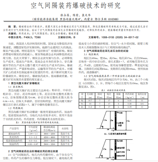 爆破理论的不断进步,使露天深孔台阶爆破应用空气间隔装药、降低其爆破炸药单耗成为可能。通过在深孔岩石 台阶进行空气间隔实验,验证了空气间隔装药在深孔台阶爆破的优越性,对降低炸药成本、提高爆破质量有积极的作用。