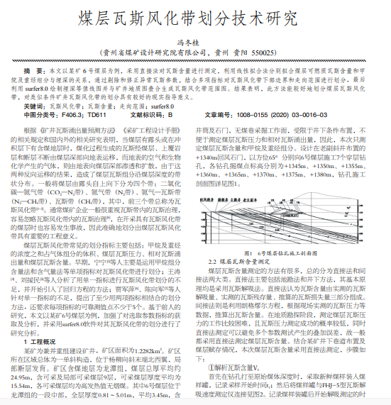 本文以某矿 6 号煤层为例,采用直接法对瓦斯含量进行测定,利用线性拟合法分别拟合煤层可燃质瓦斯含量和甲 烷及重烃组分与埋深的关系,通过剔除和修正异常瓦斯参数,结合多项指标对瓦斯风化带下部边界和走向范围进行划分,最后 利用 surfer8.0 绘制埋深等值线图并与矿井地质图叠合生成瓦斯风化带范围图。结果表明,此方法能较好地划分煤层瓦斯风化 带,对类似条件矿井瓦斯风化带的划分具有较好的现实指导意义。