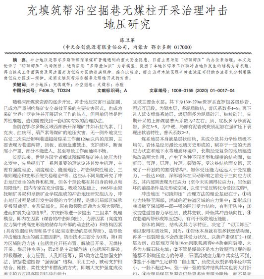 冲击地压是鄂尔多斯西部深采煤矿普遍遇到的重大安全隐患,目前主要采用“切顶卸压”的办法来治理。本文先 论证了“切顶卸压”的局限性,进而应用“多跨叠加拱”力学模型,提出了本地区综采工作面冲击地压发生的结构力学机理, 得出综采工作面隅角及周边围岩为低应力区的普遍规律。综合比较后,提出治理本地区煤矿冲击地压可行的办法是充分利用隅 角低应力区这一规律,采用充填筑帮沿空掘巷无煤柱开采的方案。