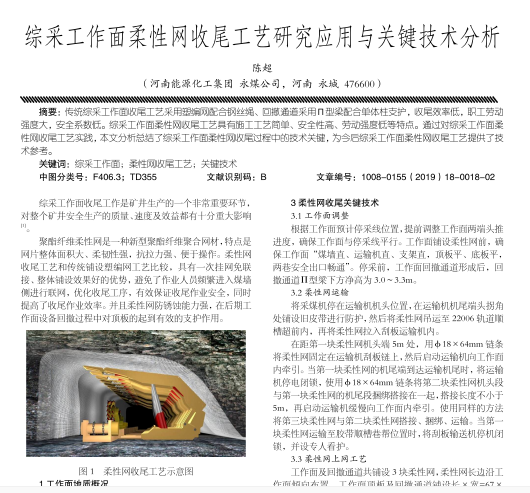 传统综采工作面收尾工艺采用塑编网配合钢丝绳、回撤涅道采用 n 型梁配合单体柱支护,收尾效率低,职工劳动强度大,安全系数低。综采工作面柔性网收尾工艺具有施工工艺筒单、安全性高、劳动强度低等特点。迈过对综采工作面柔性网收尾工艺实践,本文分析总结了综采工作面柔性网收尾过程中的授术关键,为今后综采工作面柔性网收尾工艺提供了技术参考。