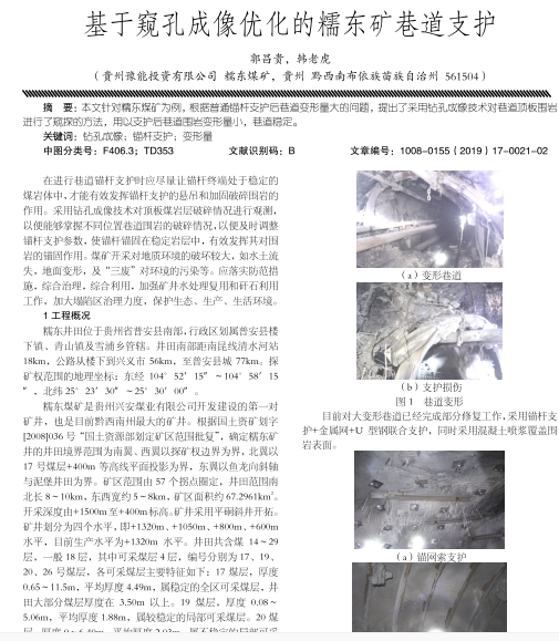 本文针对糯东煤矿为两,根挹晋遐钢杆支护后巷追变形匾大的问题,提出了采用钻了国对象技术对巷道顶板围岩进行了窥探酌方法, 用以支护后巷道围岩变形量小, 巷遮稳定。
