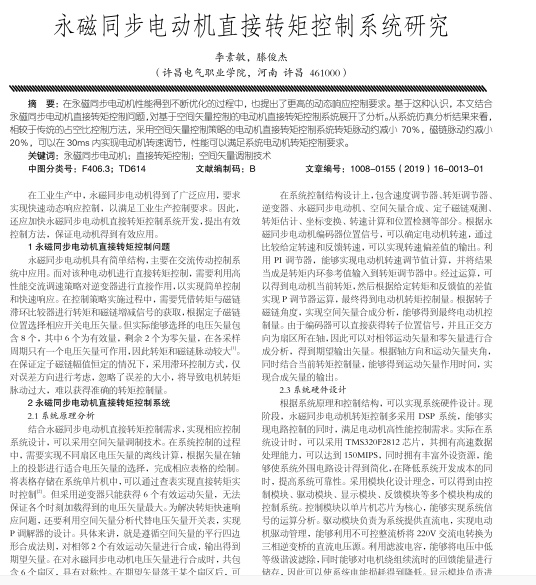 在永磁同步电动机性陛得到不断优化的过程中,也提出了吏高的动态晌应控制要求。基千这桏认识,本文结合 永磁同步电动机雪接转矩控制问题,对基千空间矢量控制的电动机直接转矩控制系统展开了分析。