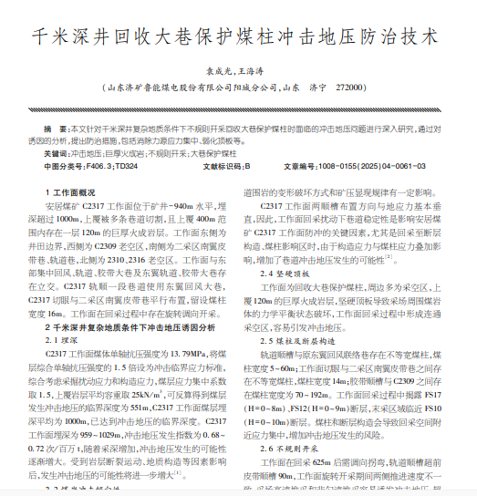 千米深井回收大巷保护煤柱冲击地压防治技术