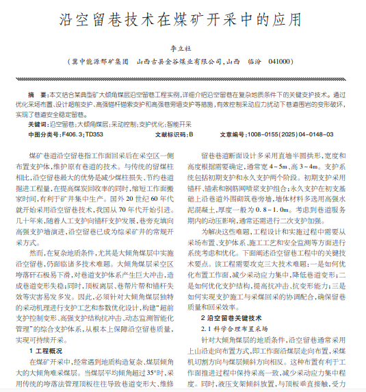 本文结合某典型矿大倾角煤层沿空留巷工程实例,详细介绍沿空留巷在复杂地质条件下的关键支护技术。