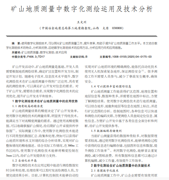 使用数字化测绘技术,可以简化矿山地质测量工作,提升效率,有助于提升矿山地质测量工作水平。