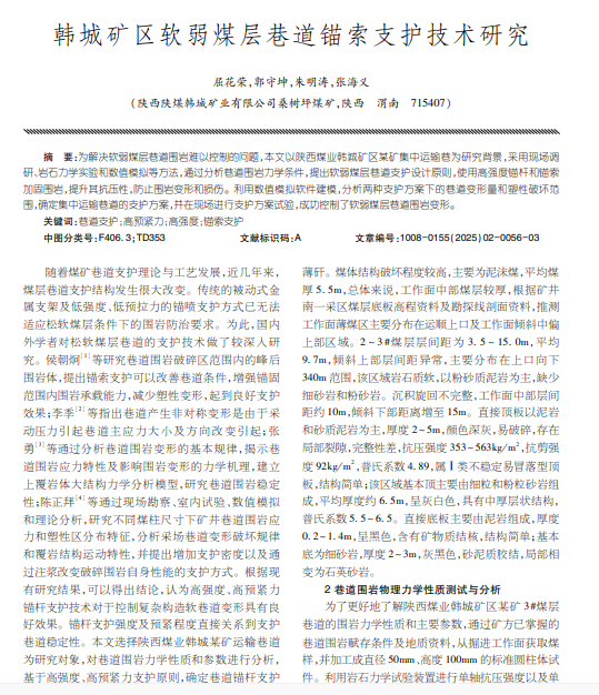 为解决软弱煤层巷道围岩难以控制的问题,本文以陕西煤业韩城矿区某矿集中运输巷为研究背景。