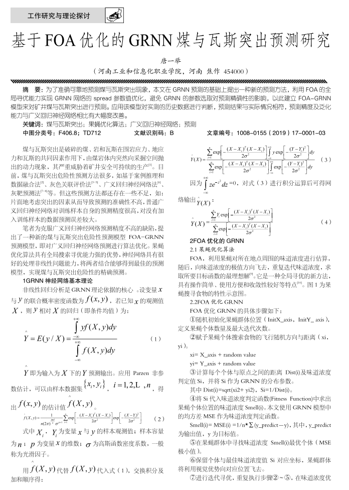 为了准确可靠地预测煤与瓦斯突出现象,本文在GRNN预测的基础上提出—种新的预测万法,利用FOA的全局寻优能力实现GRNN网络酌spread参数但优化,避免GRNN的参数选取对预测精确性的影韵,以此建立FOA-GRNN 稷型来对矿井煤写瓦斯突出进行预测。应用该榄型对买测的历史数括进行判断,预测结果与实际情况相符,预测耦度及泛化陛力与广义回归神经网络相比有大幅度改善。