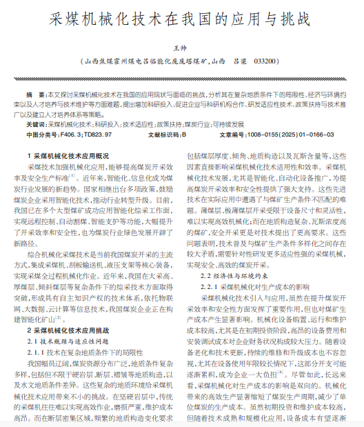 本文探讨采煤机械化技术在我国的应用现状与面临的挑战,分析其在复杂地质条件下的局限性,经济与环境约 束以及人才培养与技术维护等方面难题。