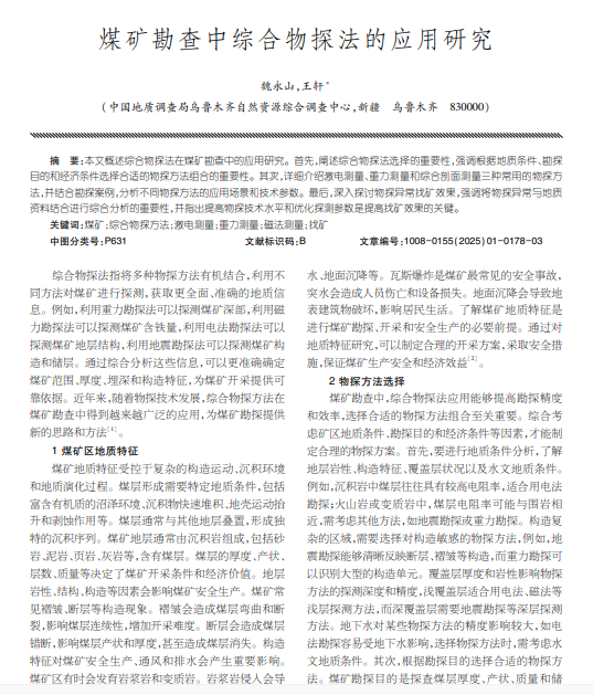 本文概述综合物探法在煤矿勘查中的应用研究。首先,阐述综合物探法选择的重要性,强调根据地质条件、勘探 目的和经济条件选择合适的物探方法组合的重要性。