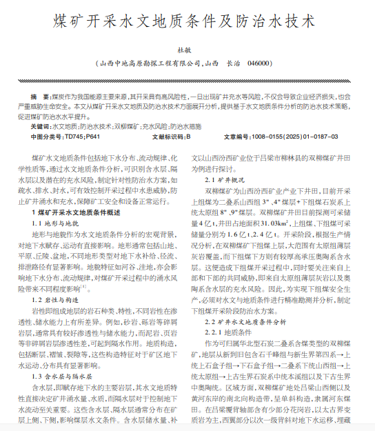 煤炭作为我国能源主要来源,其开采具有高风险性,一旦出现矿井充水等风险,不仅会导致企业经济损失,也会 严重威胁生命安全。