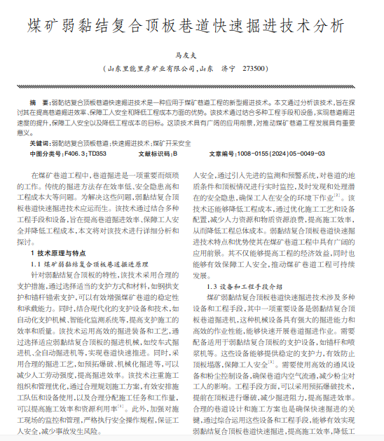 弱黏结复合顶板巷道快速掘进技术是一种应用于煤矿巷道工程的新型掘进技术。
