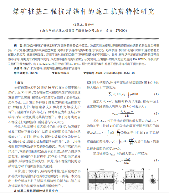 剪切破坏是煤矿桩基工程抗浮锚杆的主要破坏模式。为改善地面控制,提高巷道锚固系统的抗剪强度至关重 要。