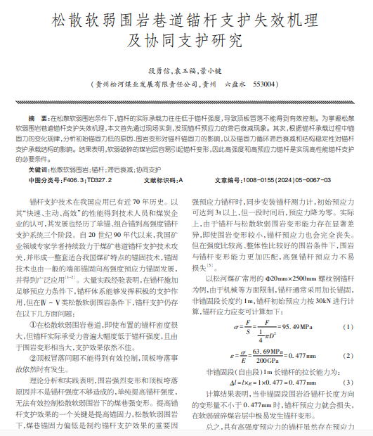 松散软弱围岩巷道锚杆支护失效机理 及协同支护研究