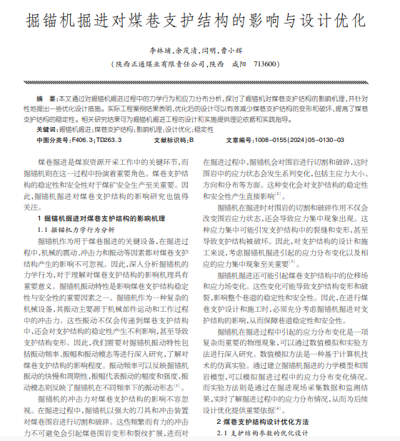 本文通过对掘锚机掘进过程中的力学行为和应力分布分析,探讨了掘锚机对煤巷支护结构的影响机理,并针对 性地提出一些优化设计措施。