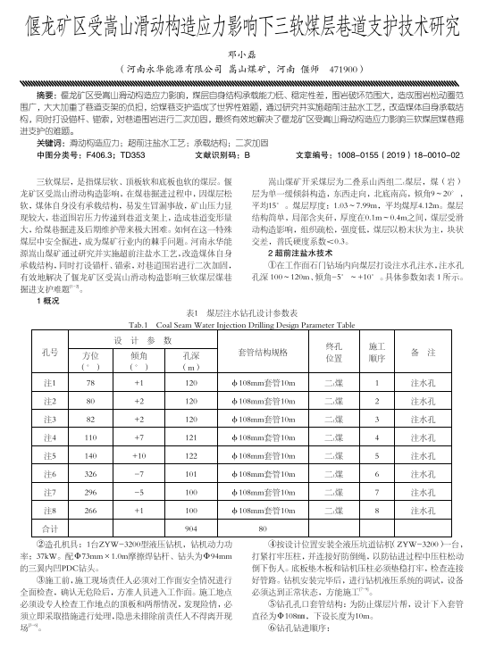 偃龙矿区受嵩山滔动构造应力影购,煤层自身结构承载能力低、稳定性差,围岩破坏范围大,造成围岩松动圈范围广,大大加重了巷遴支架的负担,给煤巷支护造成了世界性难题,遐过研究并实施超前注祜水工艺,改造煤体自身承载绝 构,同时打设箭杆、钢索,对巷道围岩进行二次加固,录终有效地解决了偃龙矿区受寓山涓动构造应力影响三软煤层煤巷掘 进支护的难题。