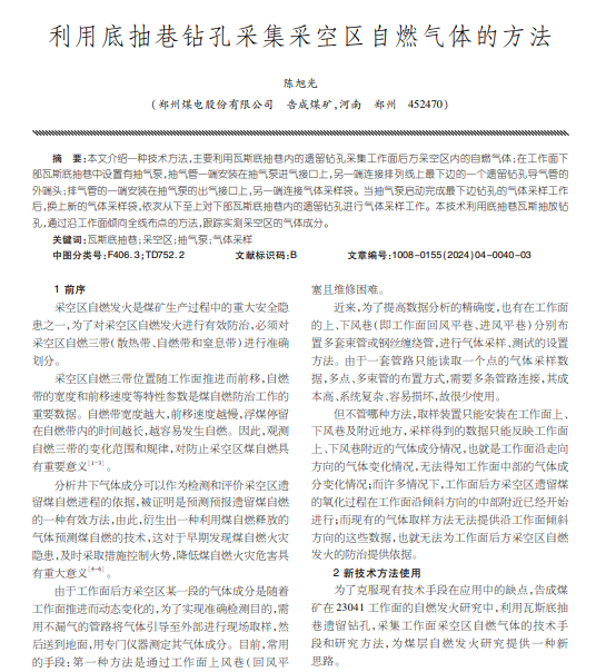 本文介绍一种技术方法,主要利用瓦斯底抽巷内的遗留钻孔采集工作面后方采空区内的自燃气体。在工作面下 部瓦斯底抽巷中设置有抽气泵,抽气管一端安装在抽气泵进气接口上。