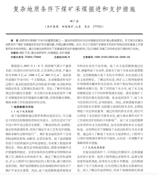 地质条件是煤矿开采中的重要因素之一,复杂的地质条件会对采煤掘进和支护提出更高要求。本文探讨在复杂 地质条件下煤矿采煤掘进和支护的关键问题,并提出解决策略。