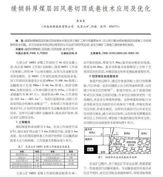 缓倾斜厚煤层回风巷切顶成巷技术是应用于煤矿工程中的重要技术,可以用于解决倾斜煤层回风巷施工中的困 难和安全问题。本文对该技术的应用过程和优化方法进行研究和总结,旨在为煤矿工程施工提供参考和指导。